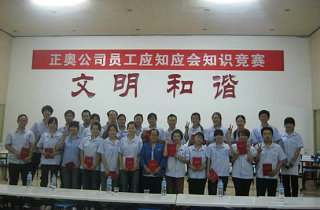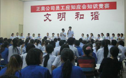 .為了促進(jìn)公司全體一線員工學(xué)習(xí)、掌握崗位應(yīng)知應(yīng)會(huì)知識(shí)和基本的崗位技能、行為規(guī)范,提升一線員工的綜合技能素質(zhì),正奧公司工會(huì)組織生產(chǎn)一線員工,在發(fā)放知識(shí)卡片、進(jìn)行全員書面測試的基礎(chǔ)上,選拔優(yōu)秀選手于9月14日晚開展了“應(yīng)知應(yīng)會(huì)知識(shí)競賽”活動(dòng),本次競賽根據(jù)生產(chǎn)工序共選撥7支參賽隊(duì),每隊(duì)由3人組成。通過必答、搶答、觀眾互動(dòng)等形式,根據(jù)各隊(duì)答題得分情況最終產(chǎn)生一、二、三等獎(jiǎng),公司領(lǐng)導(dǎo)為獲獎(jiǎng)選手們頒發(fā)榮譽(yù)證書和獎(jiǎng)金。