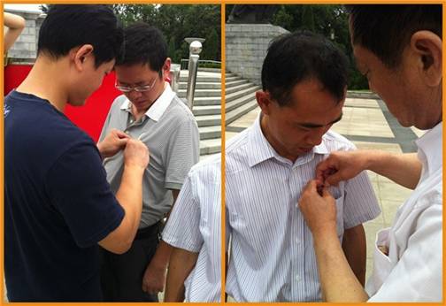進(jìn)入陵園后,在公司黨支部書記萬全進(jìn)的帶領(lǐng)下,恒通公司全體黨員在革命烈士紀(jì)念碑前重溫入黨誓詞,隨后舉行了對(duì)預(yù)備黨員鄧輝轉(zhuǎn)正,同時(shí)吸收余招輝、黃東明為預(yù)備黨員的宣誓儀式,由萬全進(jìn)書記和劉清元副總經(jīng)理分別為兩位預(yù)備黨員佩戴黨徽。